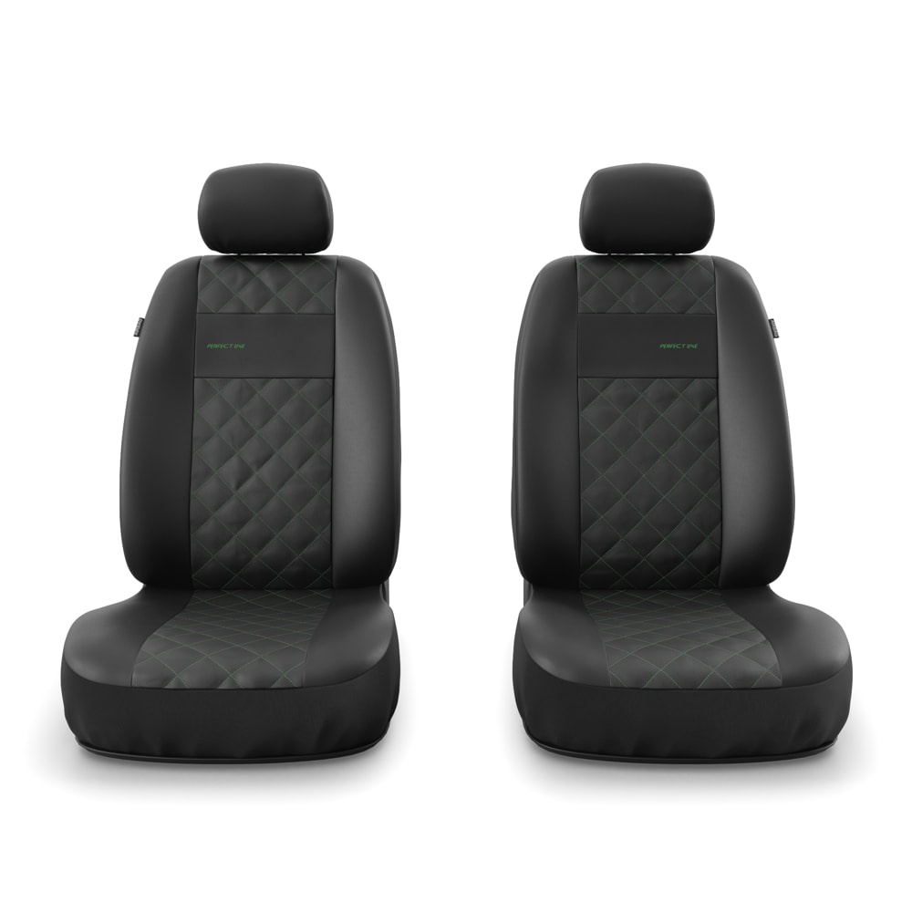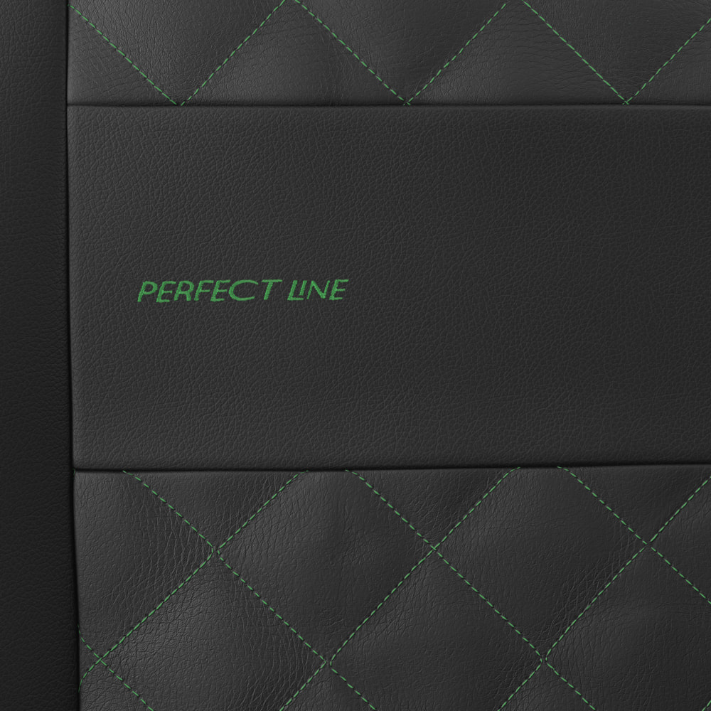 - Betrækkene er fremstillet af slidstærkt og pletafvisende kunstlæder i sort farve, og på midterdelen er de dekoreret med elegante syninger i grøn. Forsædernes betræk er desuden udsmykket med smukt broderi.